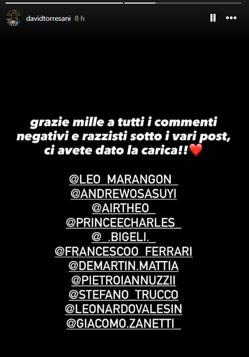 I ragazzi hanno incassato senza battere ciglio. Ma dopo la vittoria si sono tolti qualche sassolino dalle scarpe. “Grazie mille a tutti i commenti negativi e razzisti sotto i vari post, ci avete dato la carica”, ha scritto David Torresani. Il playmaker di Treviso ha dato voce al pensiero di tutto il gruppo, taggando i compagni nella story in cui ha postato il messaggio.